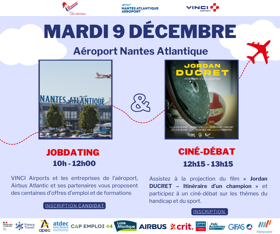 ✈️ Les Entreprises s’engagent club de Loire-Atlantique et l’Aéroport Nantes-Atlantique organisent une nouvelle édition du « Jobdating Aéro & Ciné-débat » le mardi 9 décembre.