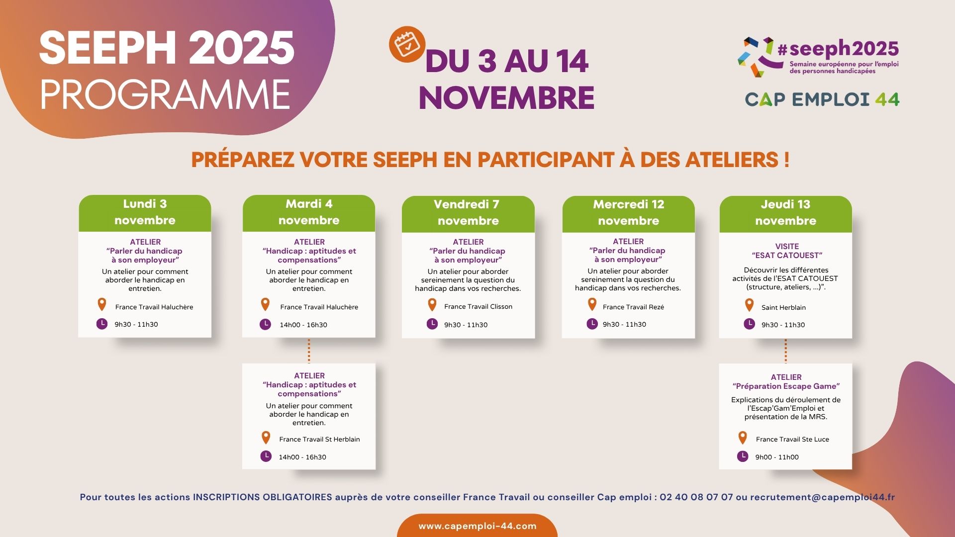 Pour toutes les actions, les inscriptions sont obligatoires auprès de votre conseiller.ère France Travail ou conseiller.ère Cap emploi !